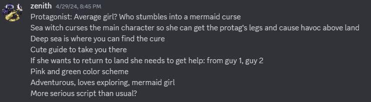The idea was simple: girl goes out to sea, gets dragged into the water, and becomes a mermaid so she can date hot mermaid men. And thus, our protagonist girl, an evil sea witch, an emo mermaid prince, and the royal advisor were born.From the start, we knew the prince would be a pivotal character, and so he got developed the most in our early documents. We needed someone who could be the moon to the protagonist's sun, and a natural foil for the cheery photographer was a colder royal with a tragic past. For him, Zuko from Avatar: The Last Airbender and Dimitri Blaiddyd from Fire Emblem: Three Houses were the primary inspirations. Our prince would turn into Prince Thioran, heir to the throne with no love for humans.Once we had a general direction, the research began. I looked into other games like what we were planning to make, and I was shocked to see there really weren't many mermaid games out there, and even fewer mermaid otome games.